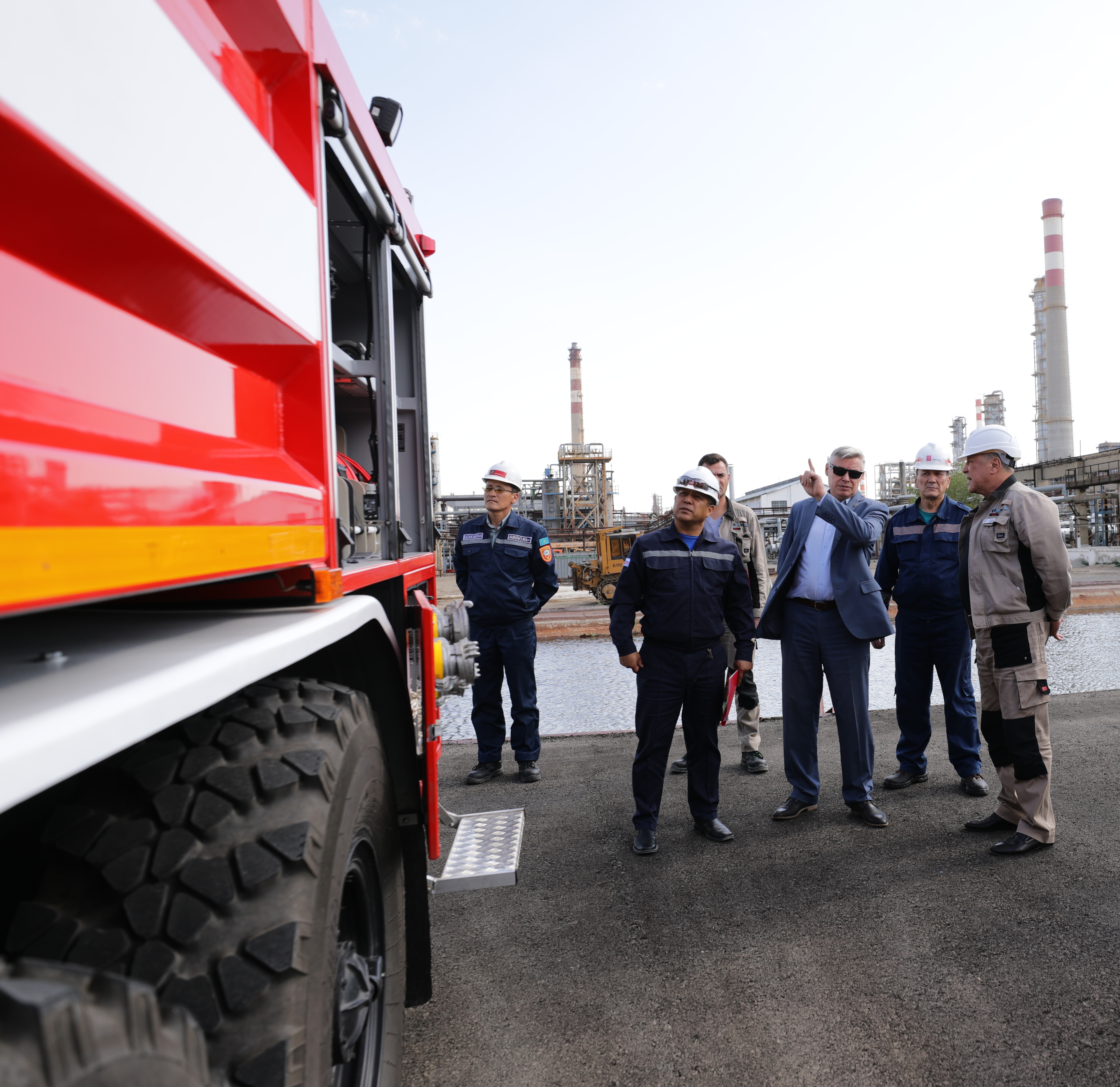 «АМӨЗ» ЖШС бас директоры Шухрат Данбай Атырау облысының «Өрт сөндіруші» АҚ Атырау облысы филиалының директоры Юрий Толстов және №16-ӨСАҚБ бастығы Канат Крыкбаевпен бірге сатып алынған өрт сөндіру автокөлігінің жауынгерлік есеп отыратын кабинасына отырып, зауыттың аумағын айнала жүріп өтіп, техниканың сапалы жүрісіне, заманауи өрт сөндіру құрылғыларымен жабдықталуына жақсы баға берді.