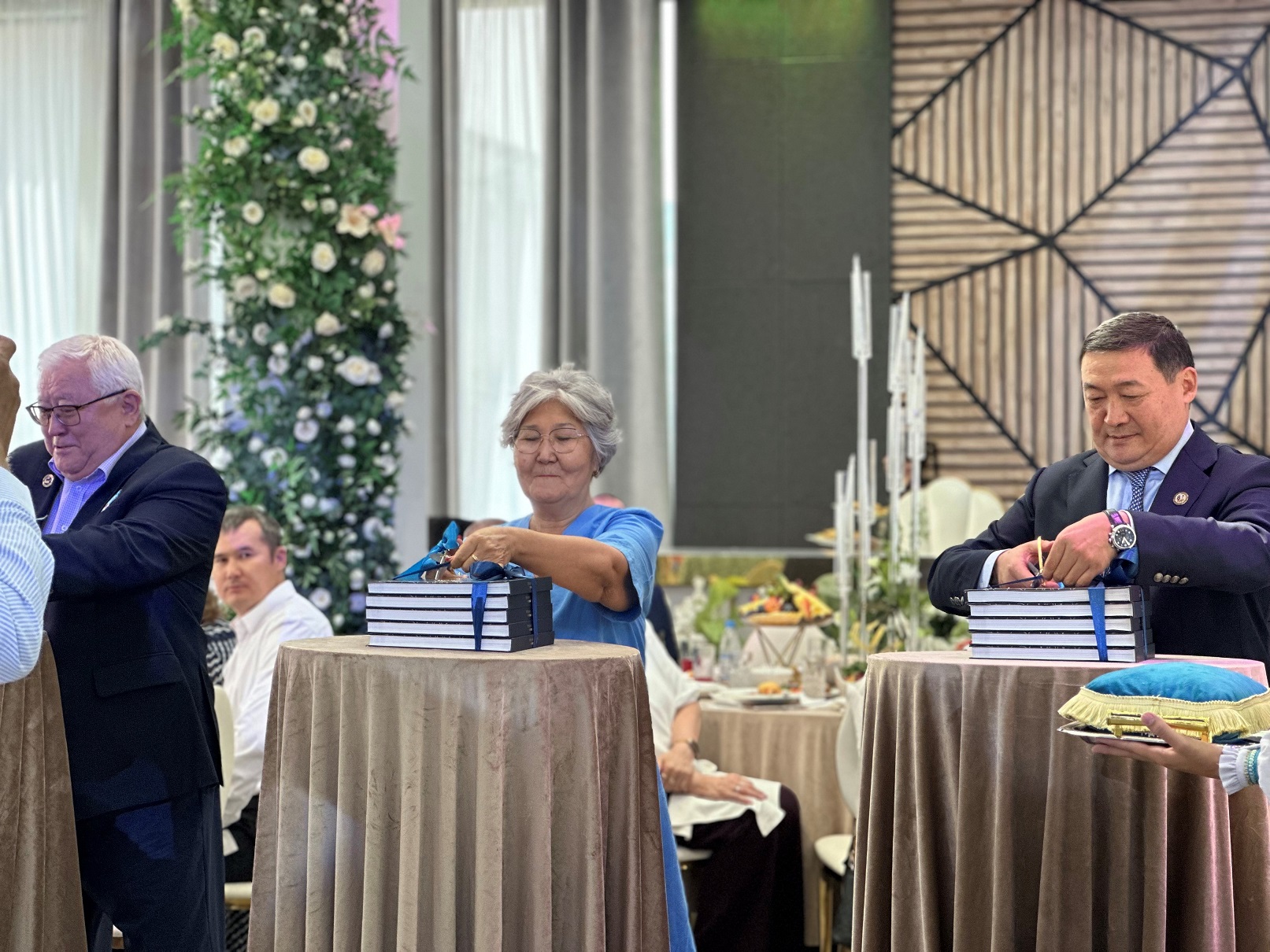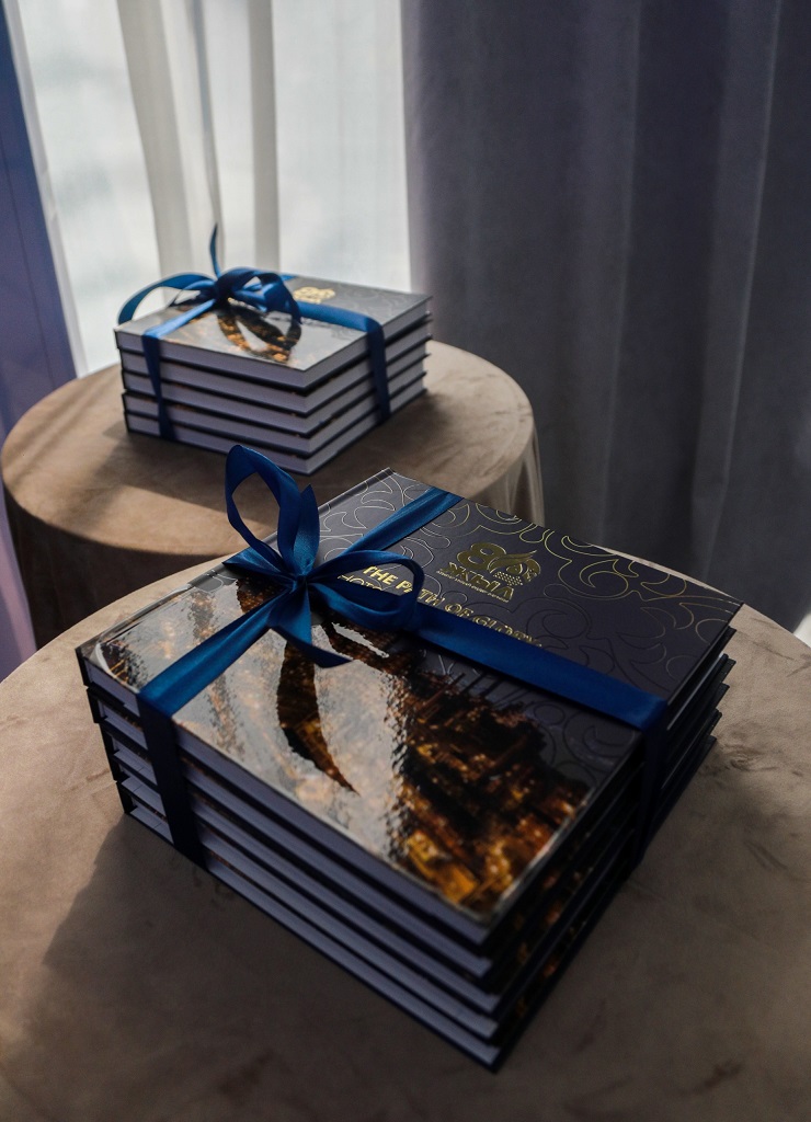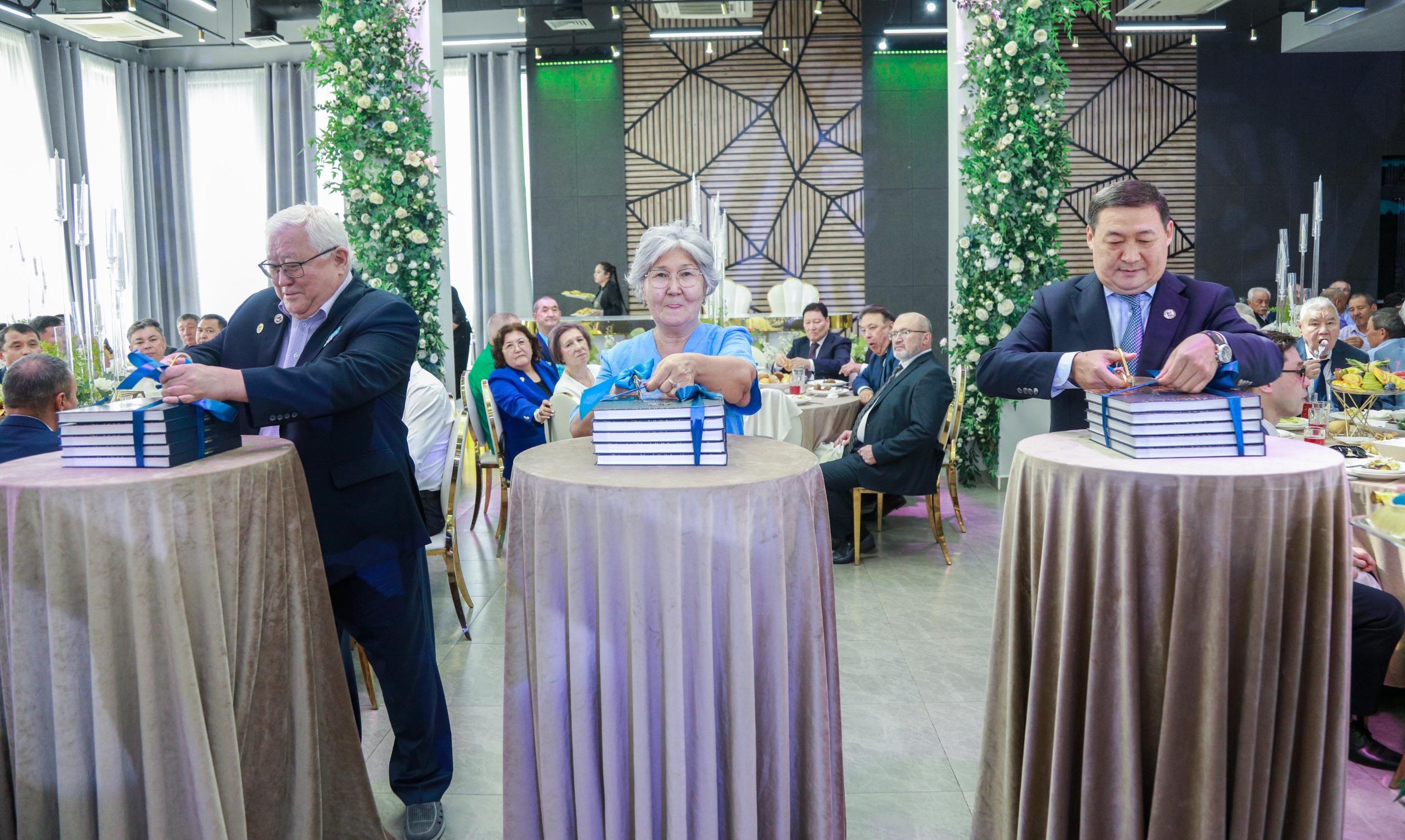 Праздничное мероприятие продолжилось в банкетном зале ABK Hall, где состоялась презентация документального фильма «Даңқ жолы. Таспадағы тарих» и книги «Данқ жолы. Суреттер сөйлейді».